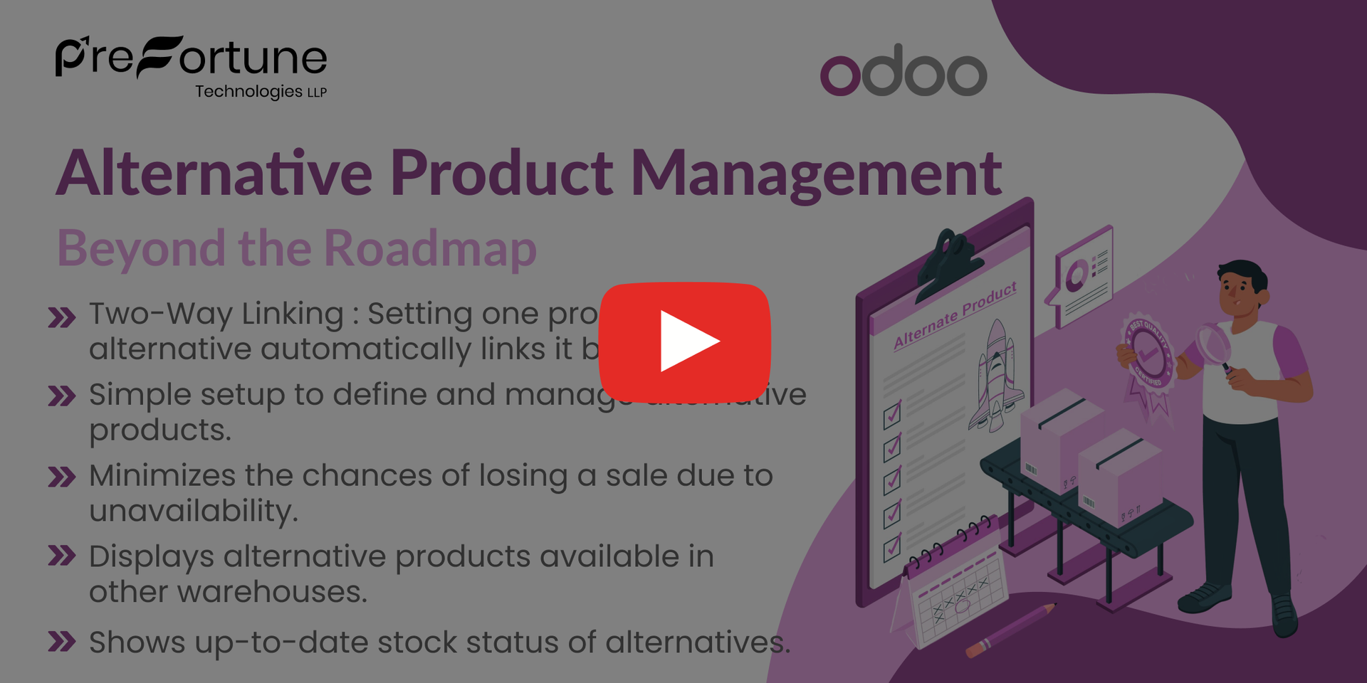 Our all-inclusive Odoo – Alternative Product Management enhances the sales process by intelligently suggesting alternative products when the requested item is out of stock. Designed to minimize lost sales and improve customer retention, it allows businesses to define and manage alternative products with ease. The system supports two-way linking of alternatives, real-time stock visibility across multiple warehouses, and seamless integration with Odoo’s Sales and Inventory modules. By displaying available substitutes directly within the product and sales views, it empowers sales teams to offer immediate solutions, boost revenue, and ensure customer satisfaction.