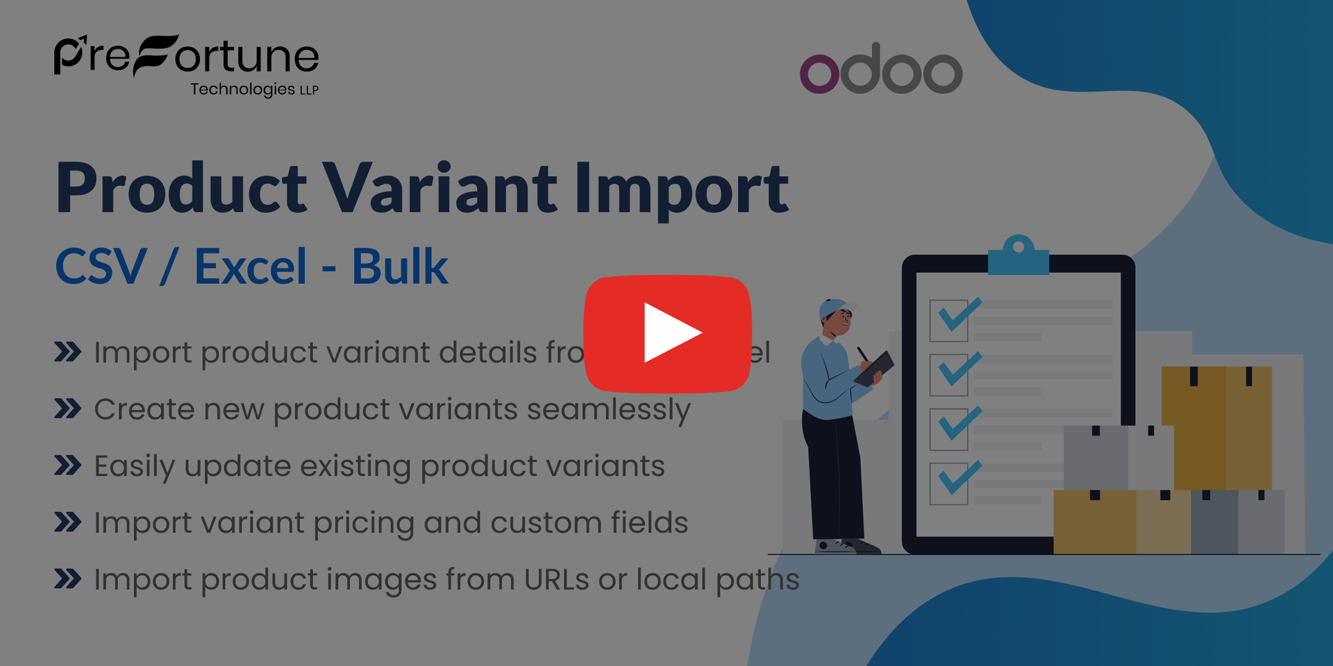 Our all-inclusive CSV / Excel - Bulk Product Variant ImportOur Odoo app simplifies the process of importing products along with their variants directly from CSV or Excel files. With this module, you gain the flexibility to import custom fields as well. Seamlessly create or update both products and their variants with essential details like images, prices, quantities, and stock levels directly from your CSV or Excel files. Easily identify and manage products and variants with the 'Unique Identification' field. Simplify your product management workflow with our Odoo app today!