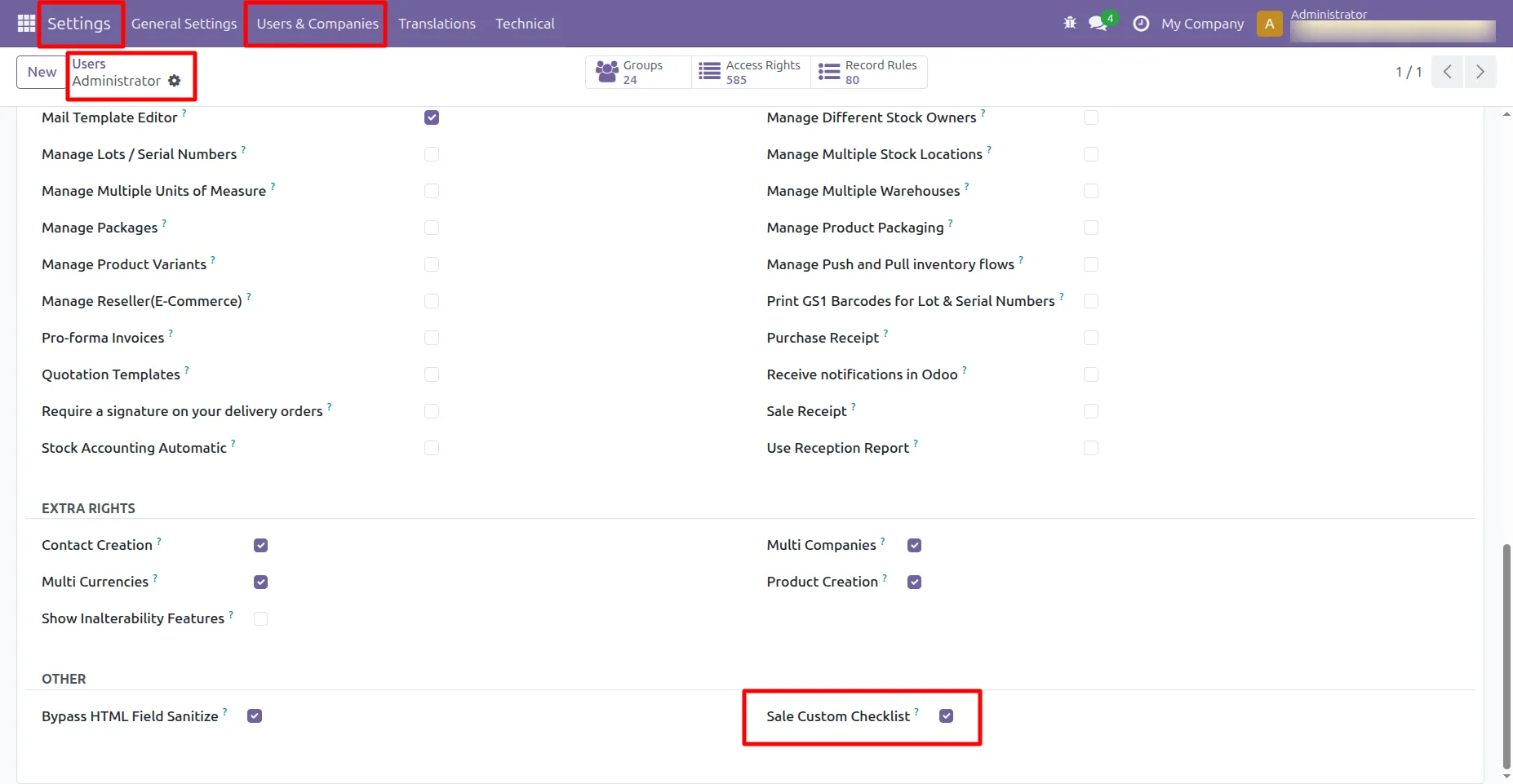 1. [TURN ON DEVELOPER MODE] Then Go to Settings -> User & Companies -> Select user -> In Access Rights -> Other ->Turn ON Sale Custom Checklist