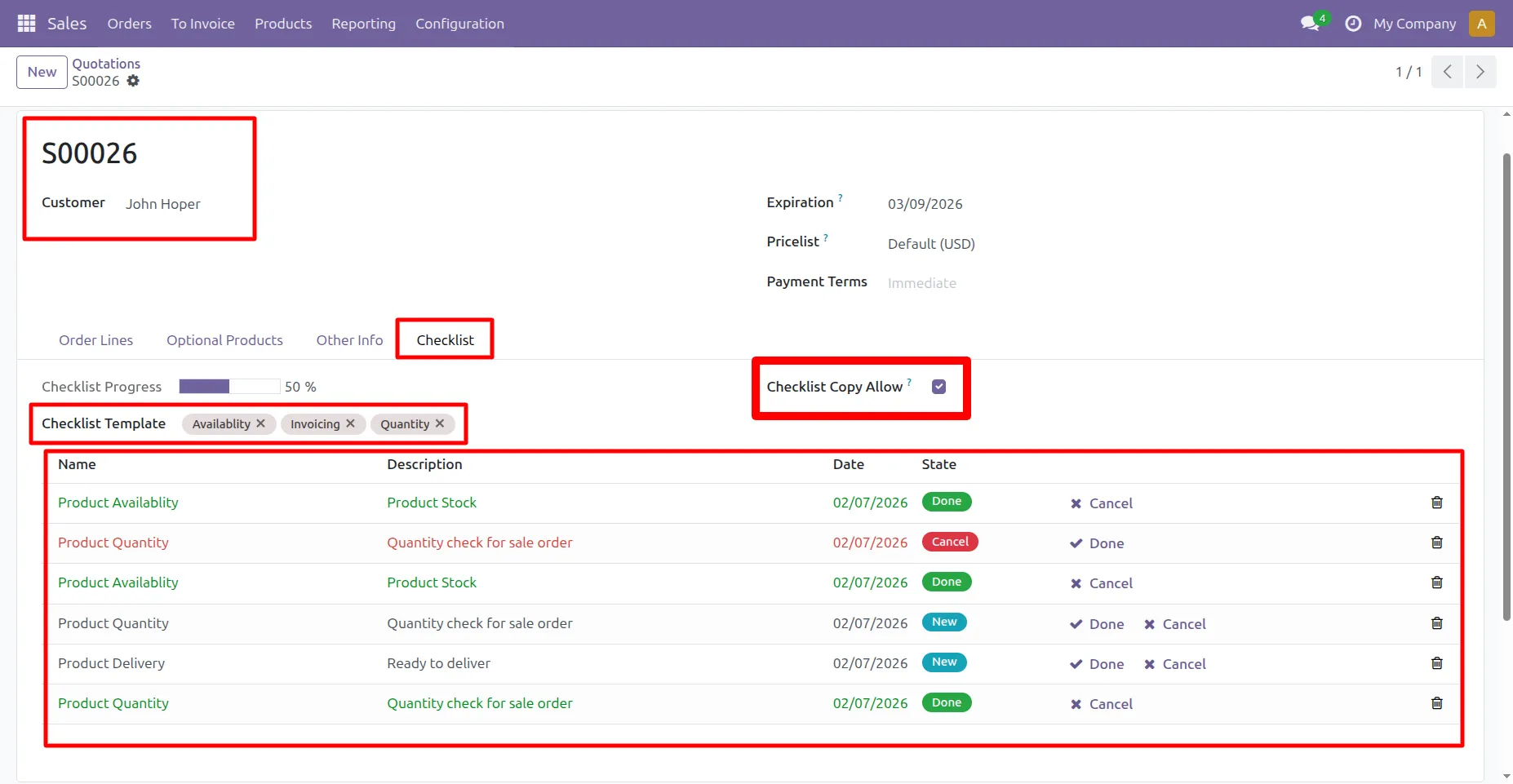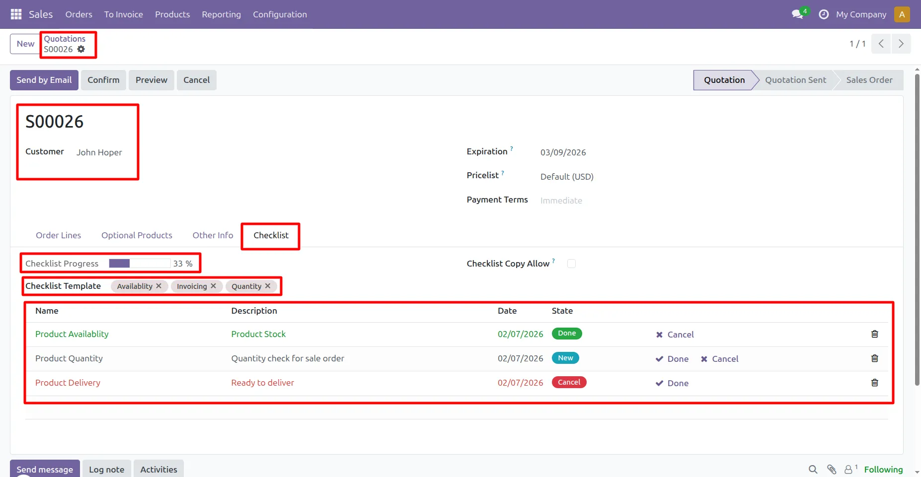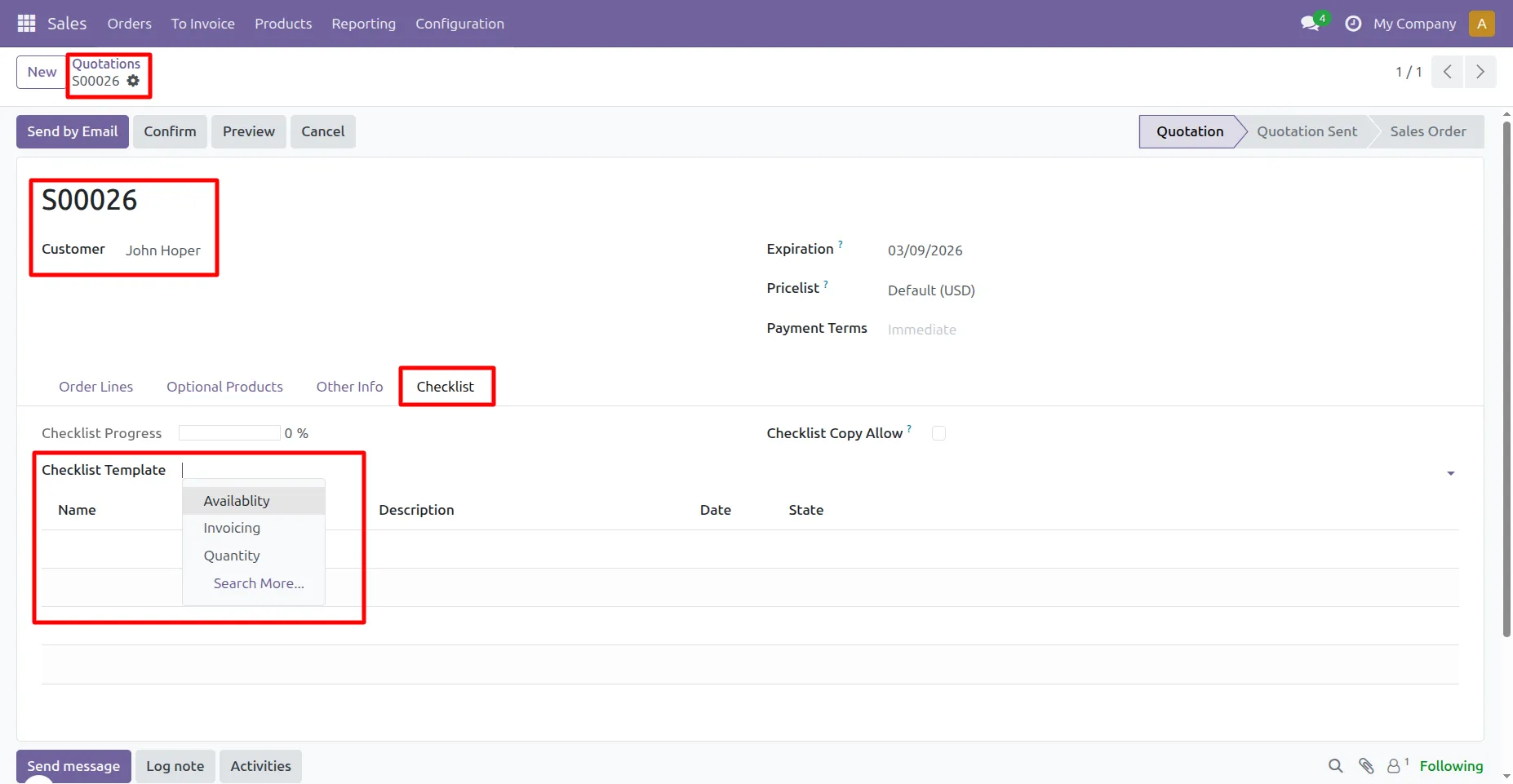 Can I create a checklist for quotation in Odoo?