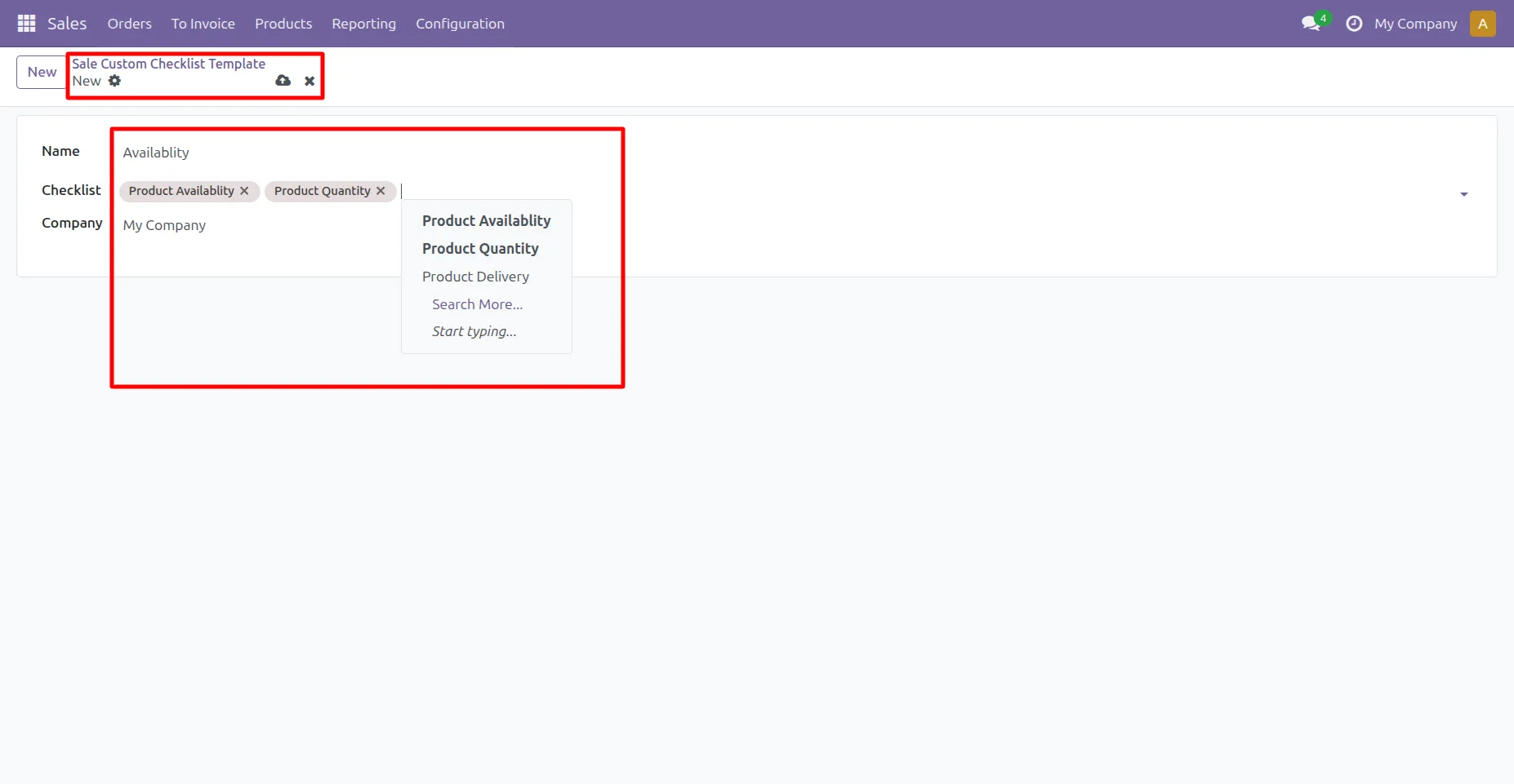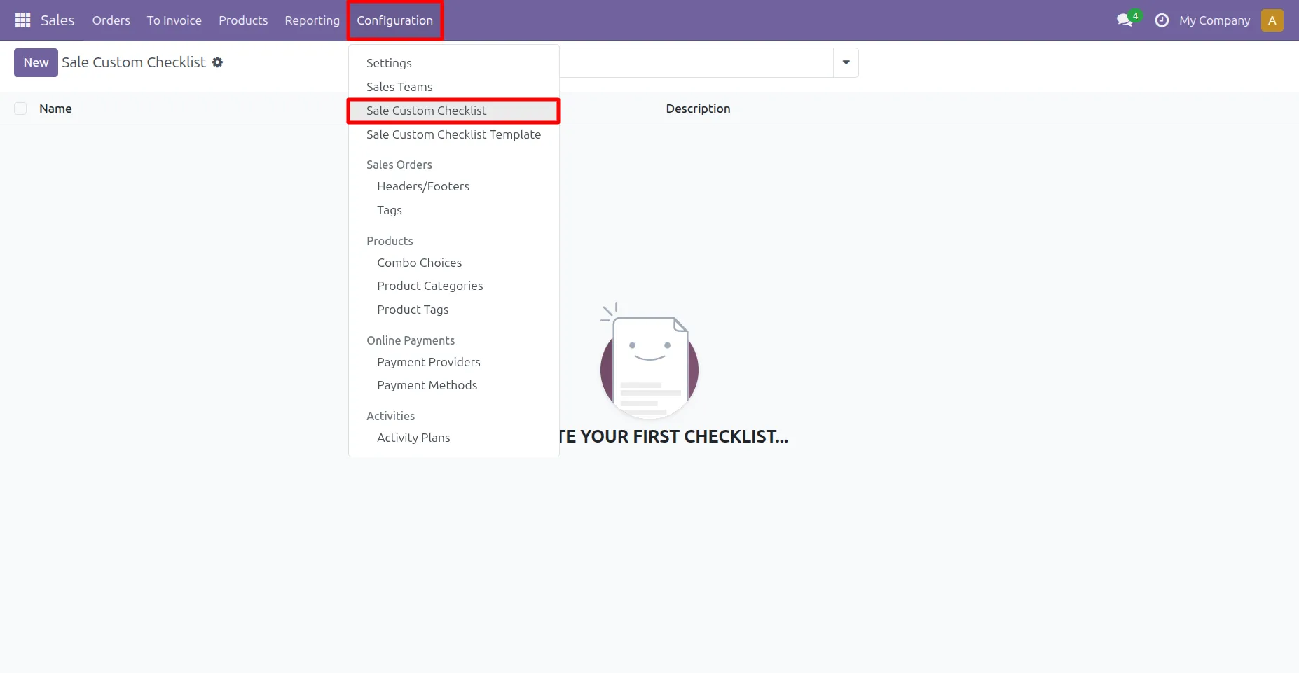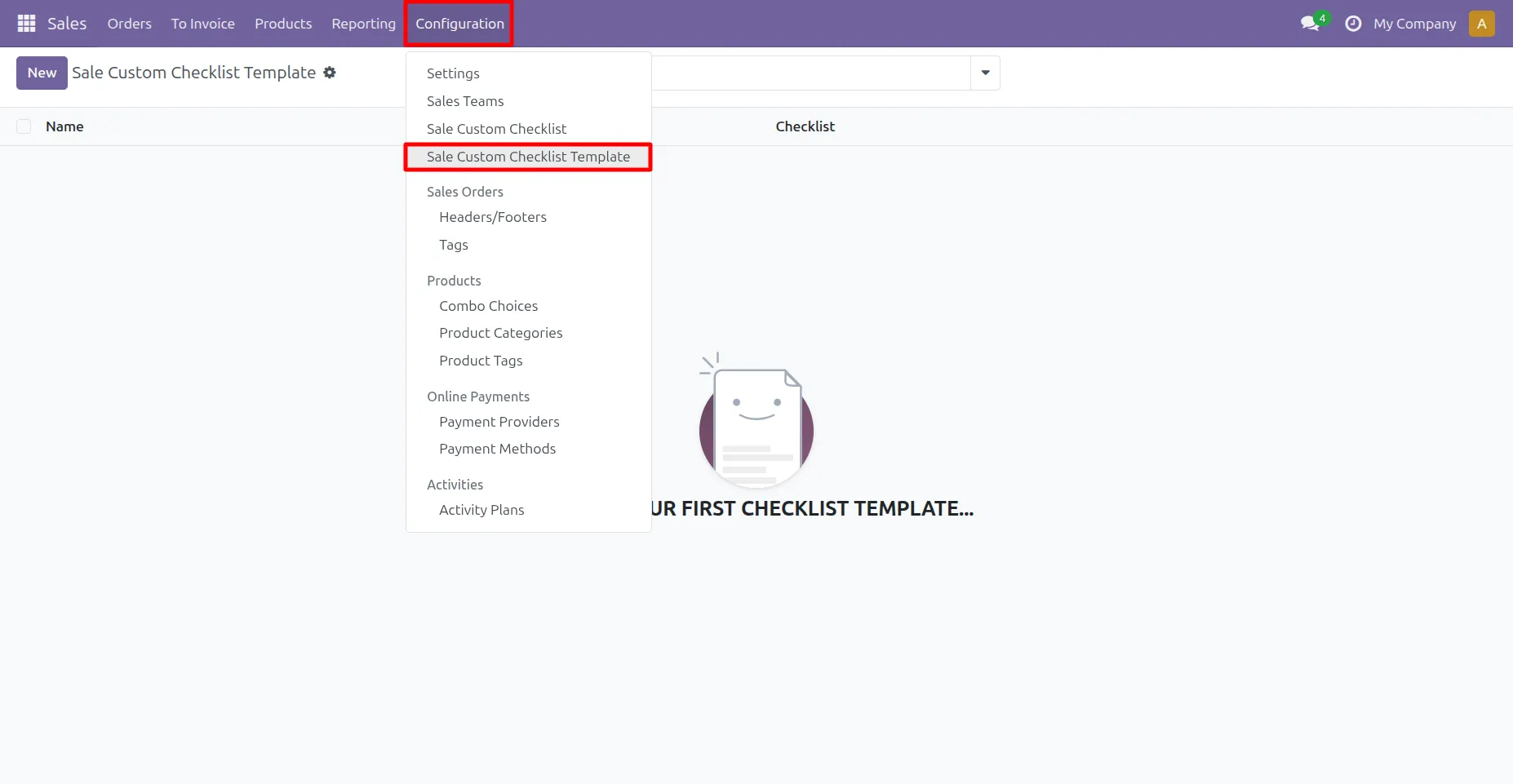 5. Go to Sale -> Configuration -> Sale Custom Checklist Template menu