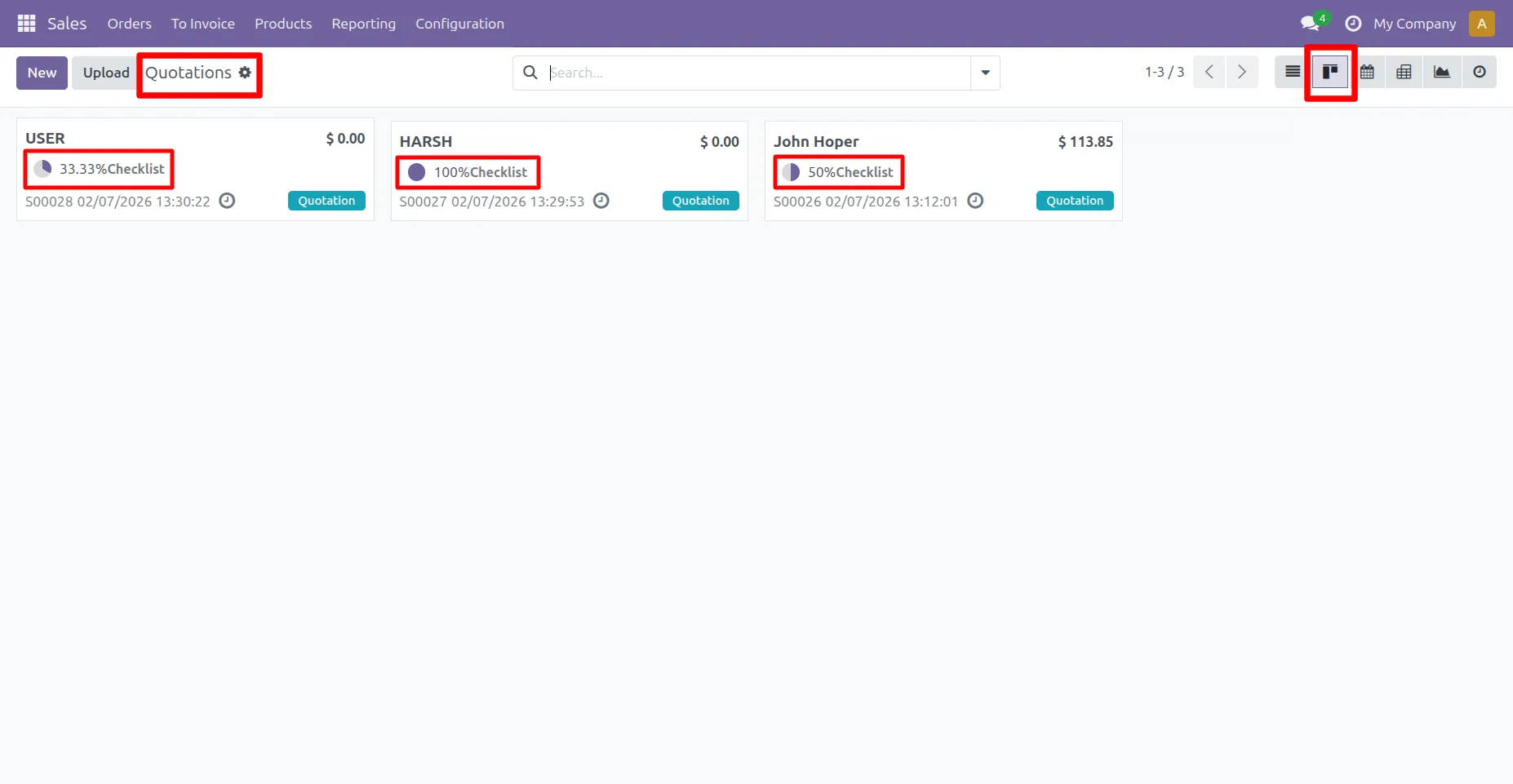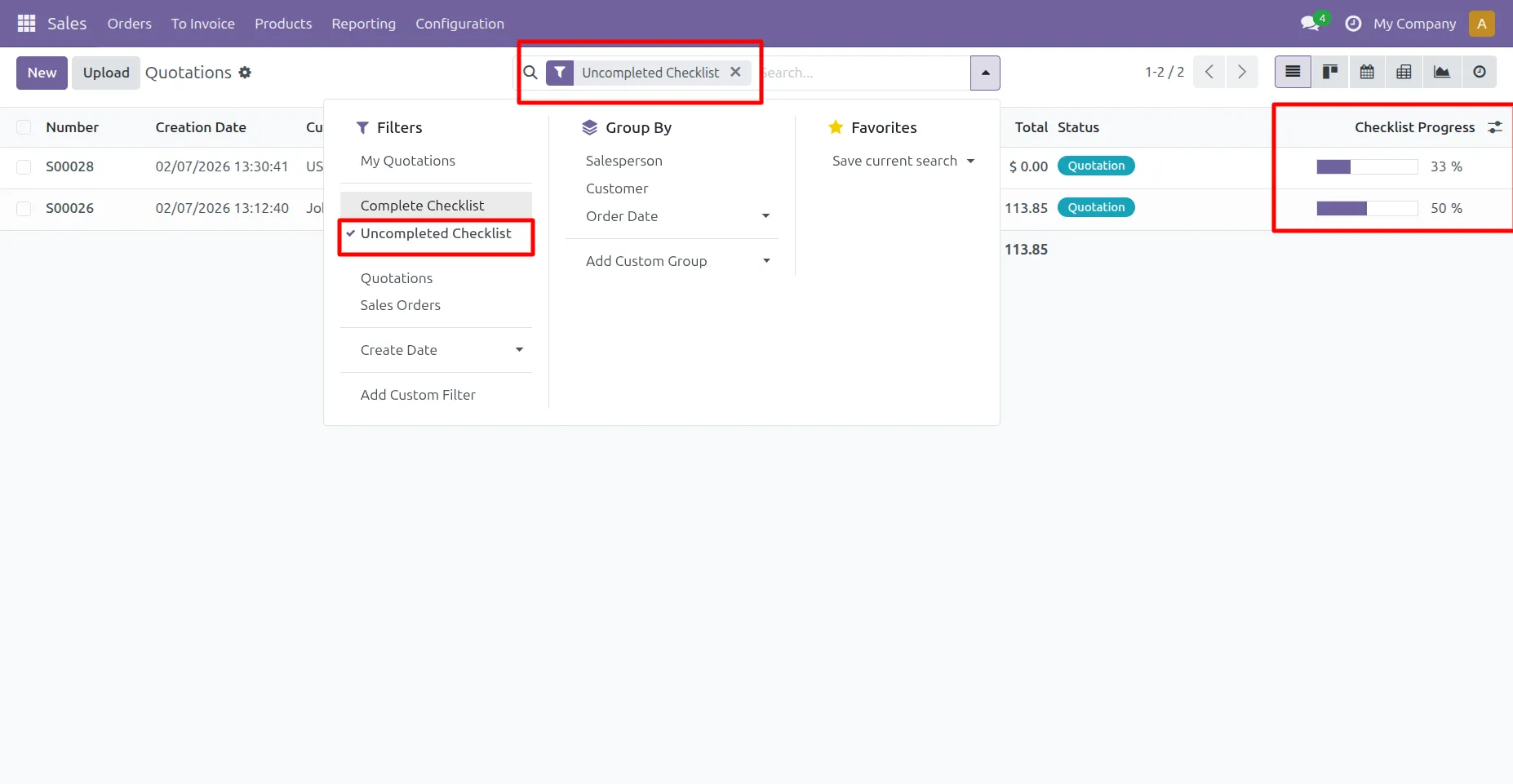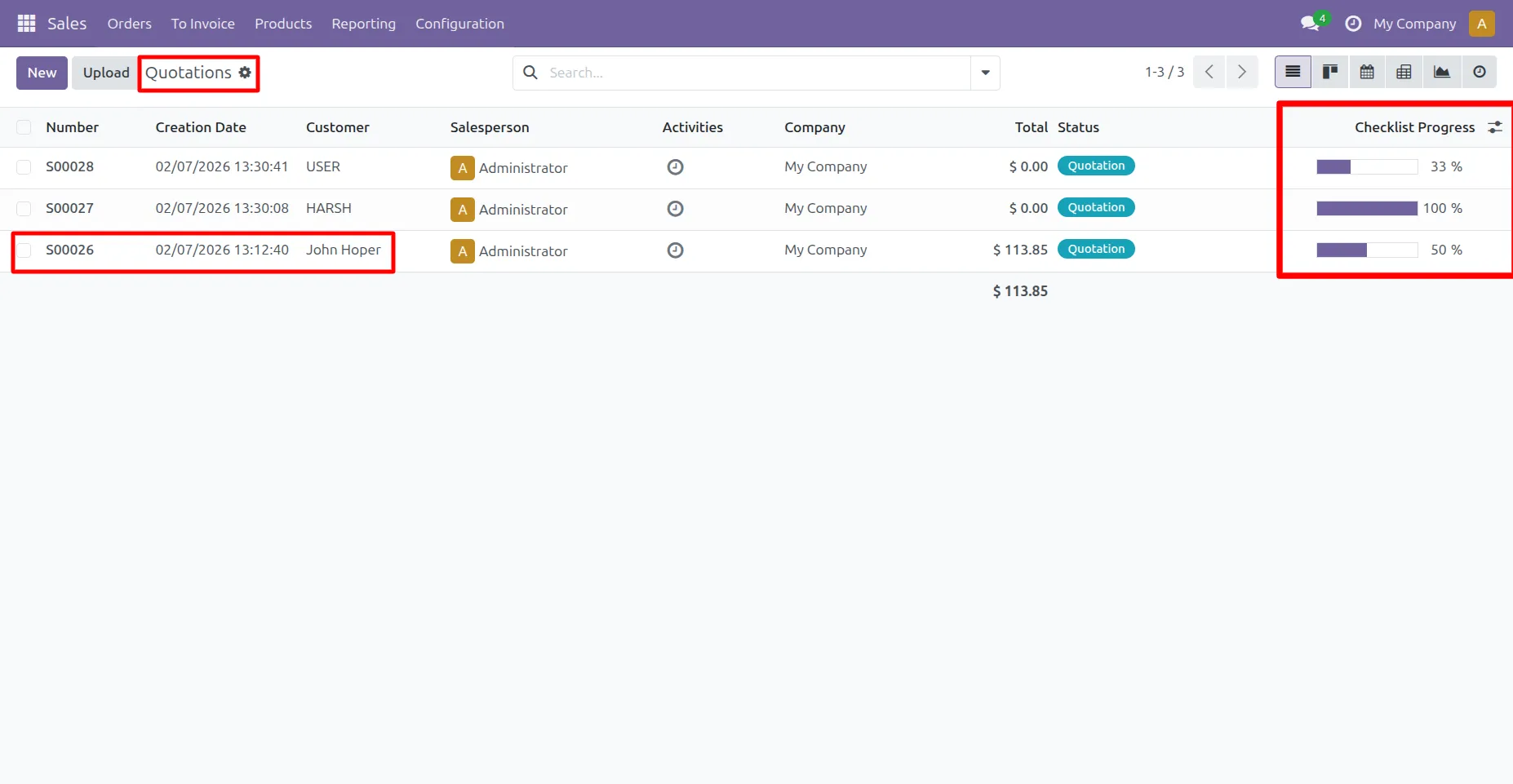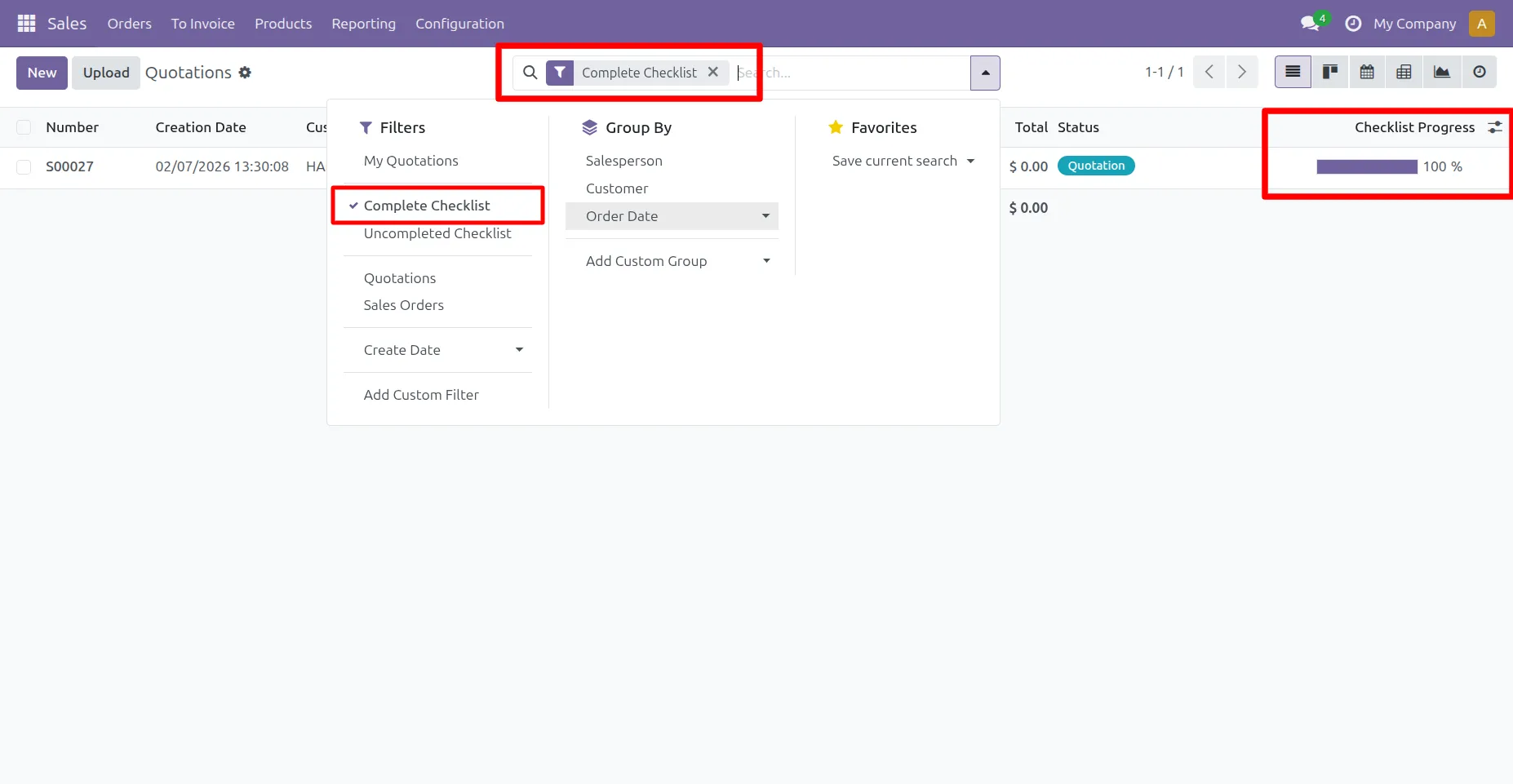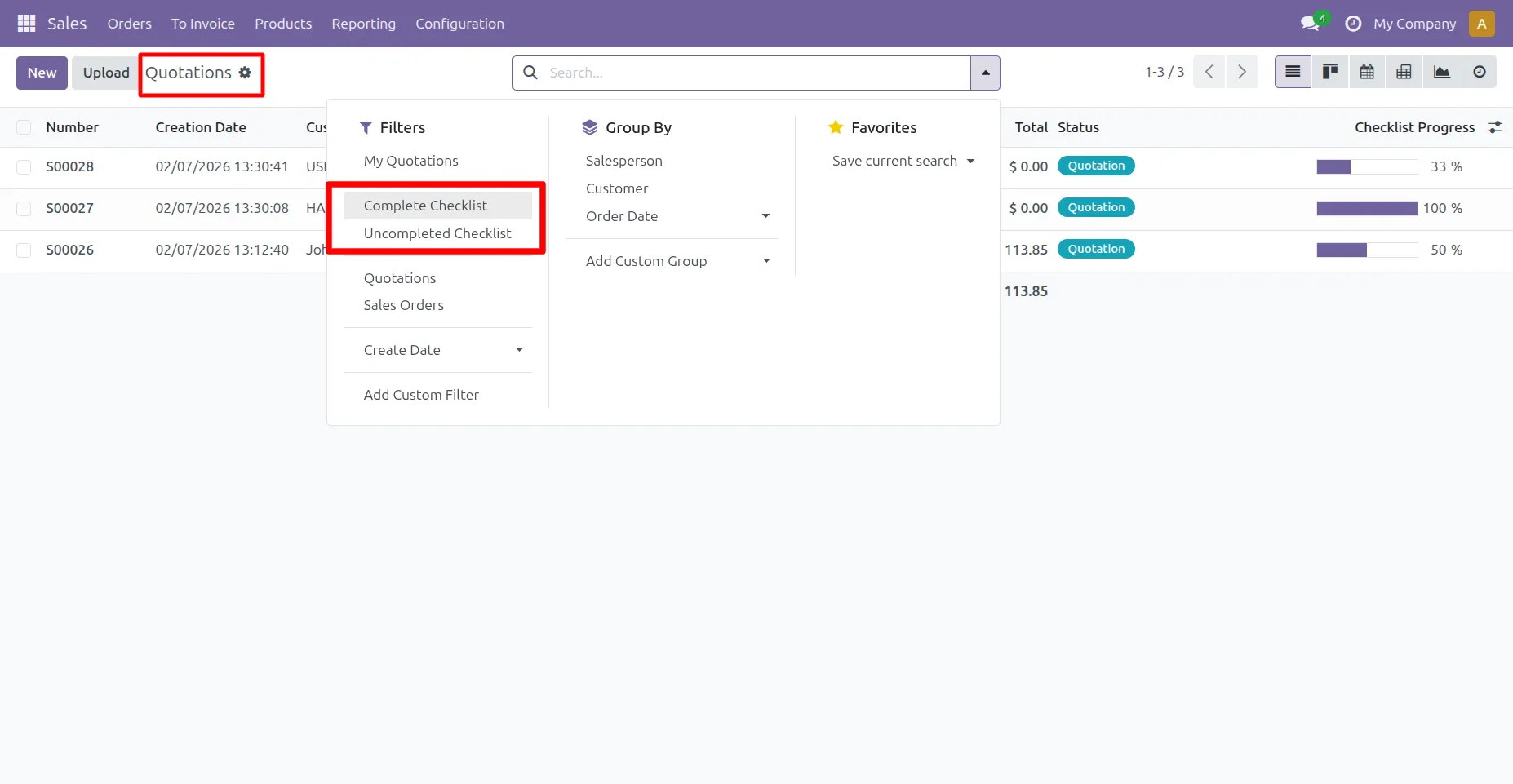 12.Go to Sale -> Quotation ->User can see checklist progress percentage in List view.