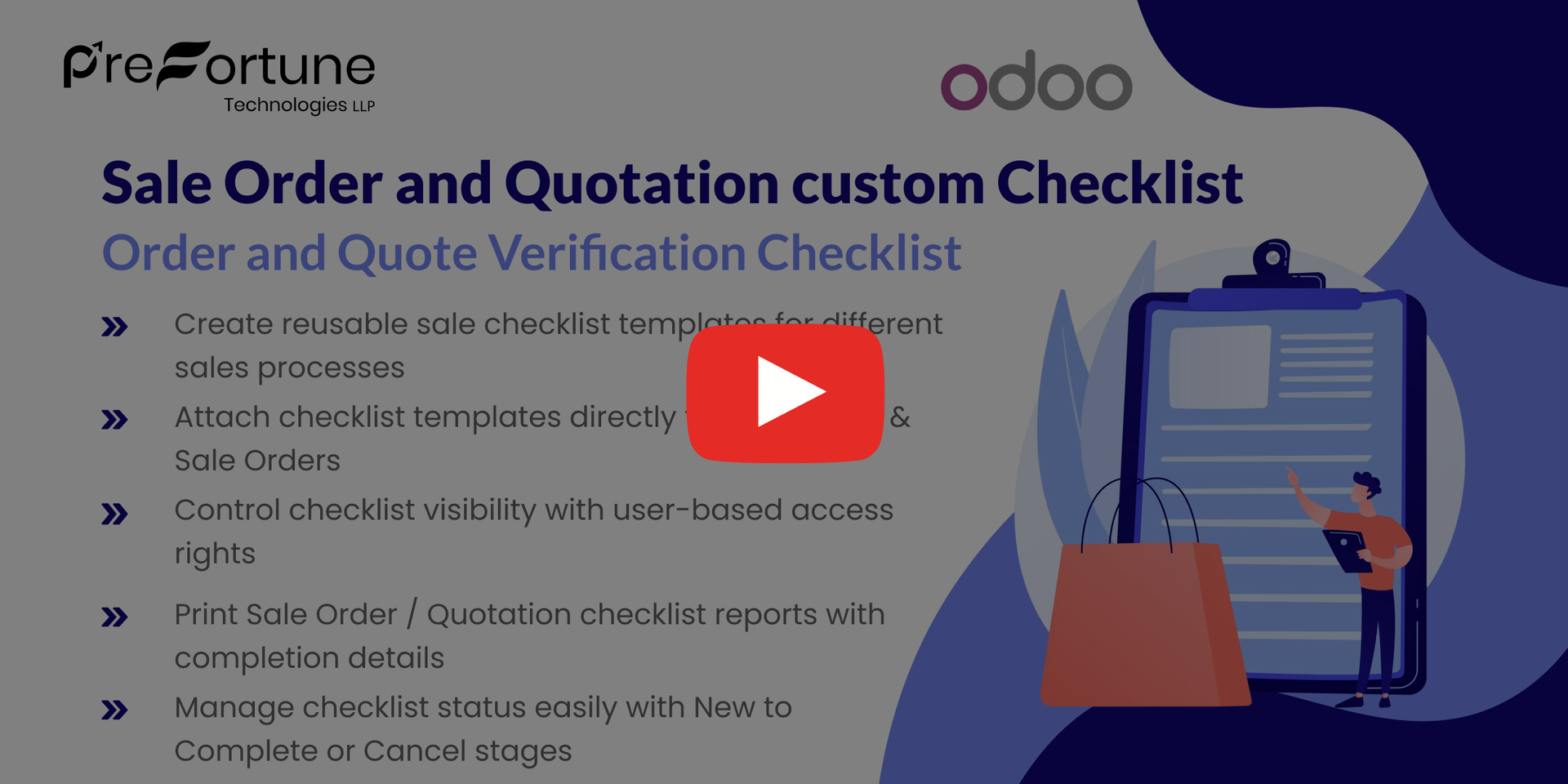 Make the checklists customizable for sale orders and quotations in Odoo to ensure all necessary processes are accomplished prior to confirming the sale.