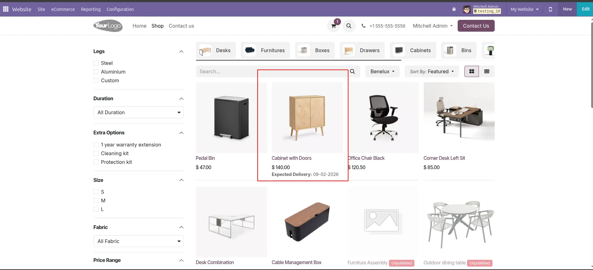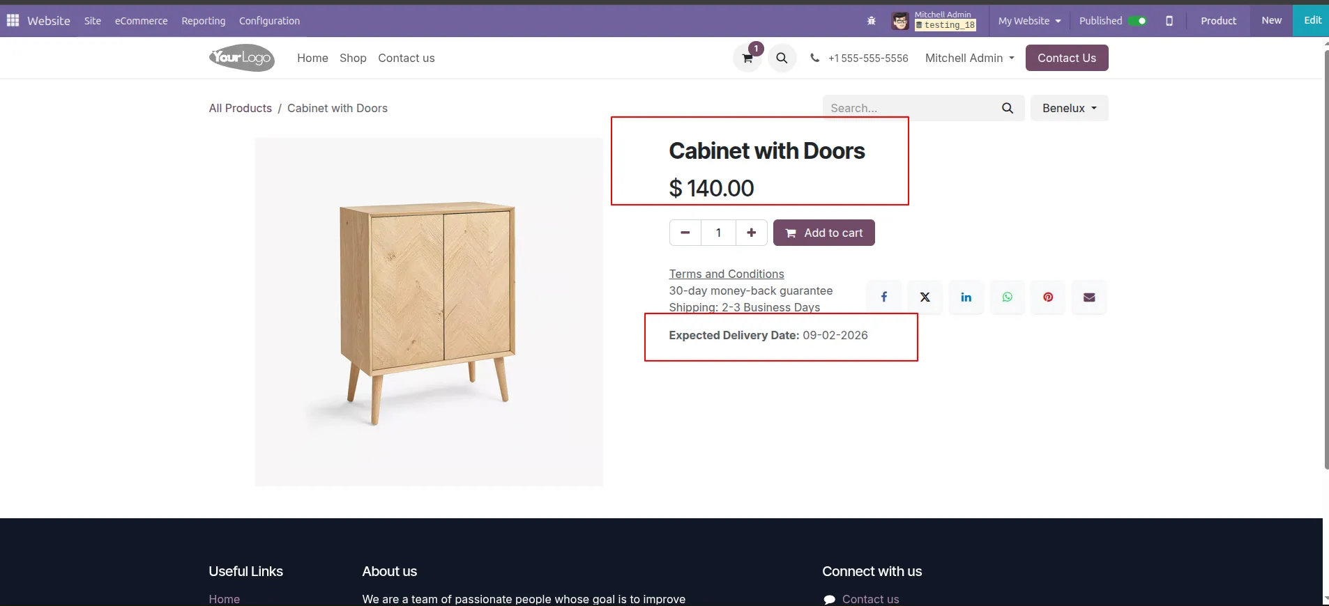 The calculated Odoo website delivery date is displayed on the shop page and product detail page, giving customers better visibility before they make a purchase decision.