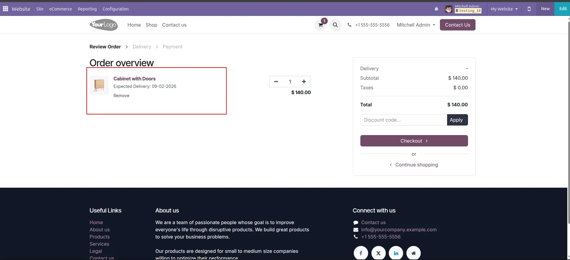 To further improve transparency, the same Odoo ecommerce delivery estimate is also shown in the cart and checkout pages, allowing customers to review delivery information before placing the order.