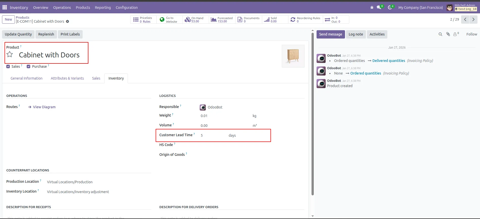 3.Open the product and set the Customer Lead Time (days) in the Inventory tab.
